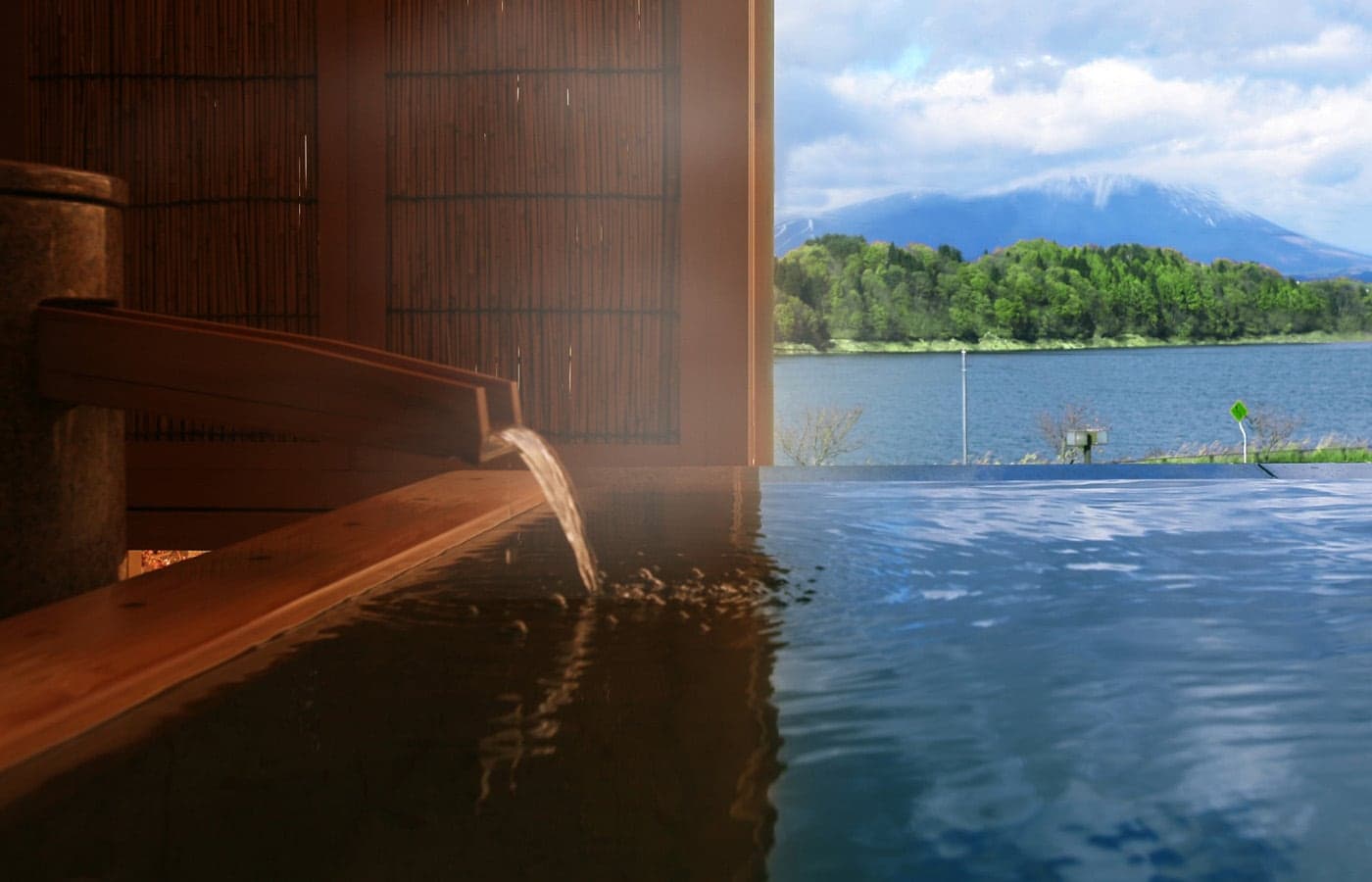 手に届くように広がる静かな御所湖の眺めと岩手山の雄姿。絶景の露天風呂「檜風呂」、ミクロの気泡にうっとり包まれる「シルクバス」ご宿泊のお客様には、どちらの露天風呂もお楽しみいただけるように、朝晩で男女の入れ替え制をとらせていただいております。