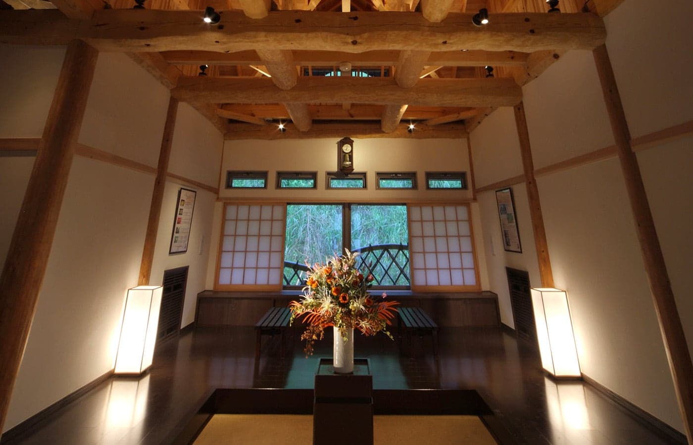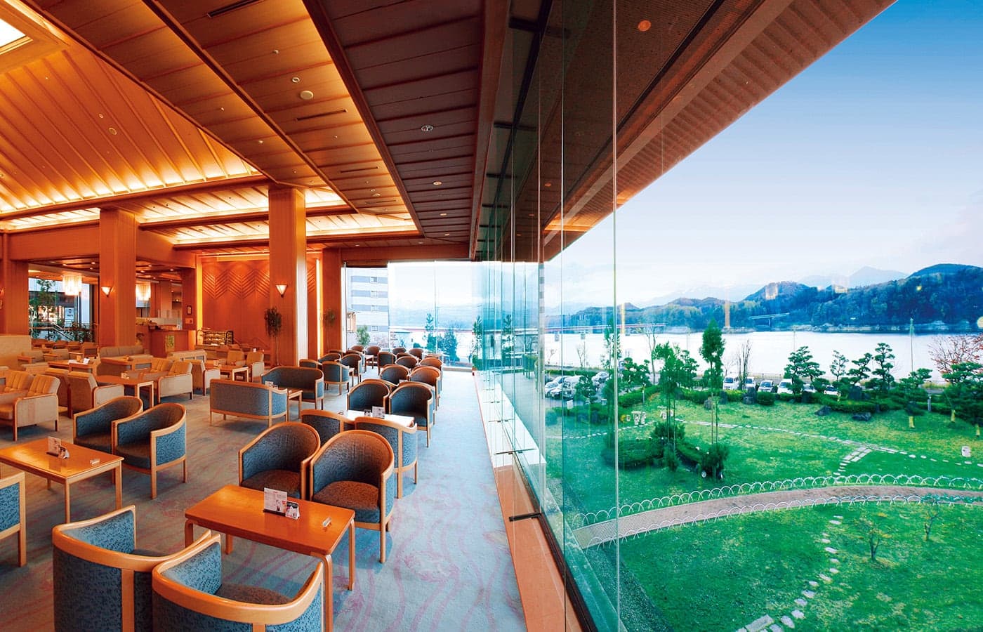 正面玄関を入ると広々としたロビーがあります。和風リゾートにふさわしい吹き抜けのゆったりとした空間は、憩いの時間をあたえてくれます。御所湖を眺めながら、穏やかに流れる時間の中でお寛ぎいただけます。