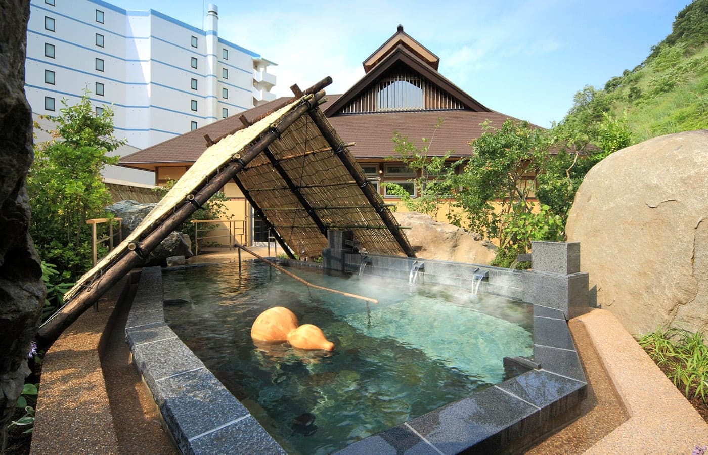 八角形の屋根が印象的な打たせ湯タイプの露天風呂です。夜には庭園を照らす照明が幻想的な雰囲気をかもしだします。