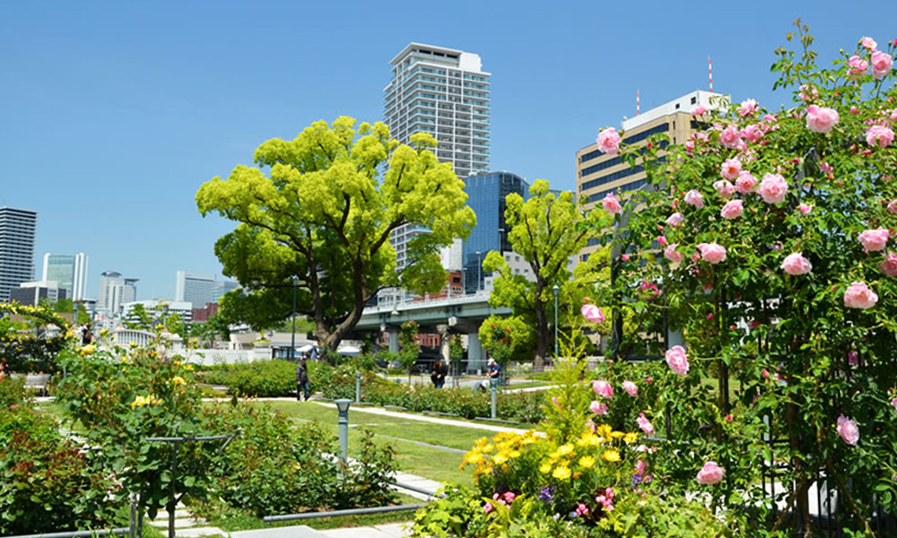 堂島川と土佐掘川にはさまれた全長約1.5kmの緑豊かな都心のオアシスです。中央公会堂や府立中之島図書館といった重厚な建築物が自然と同時に楽しめる美しい景観が人気を集めています。