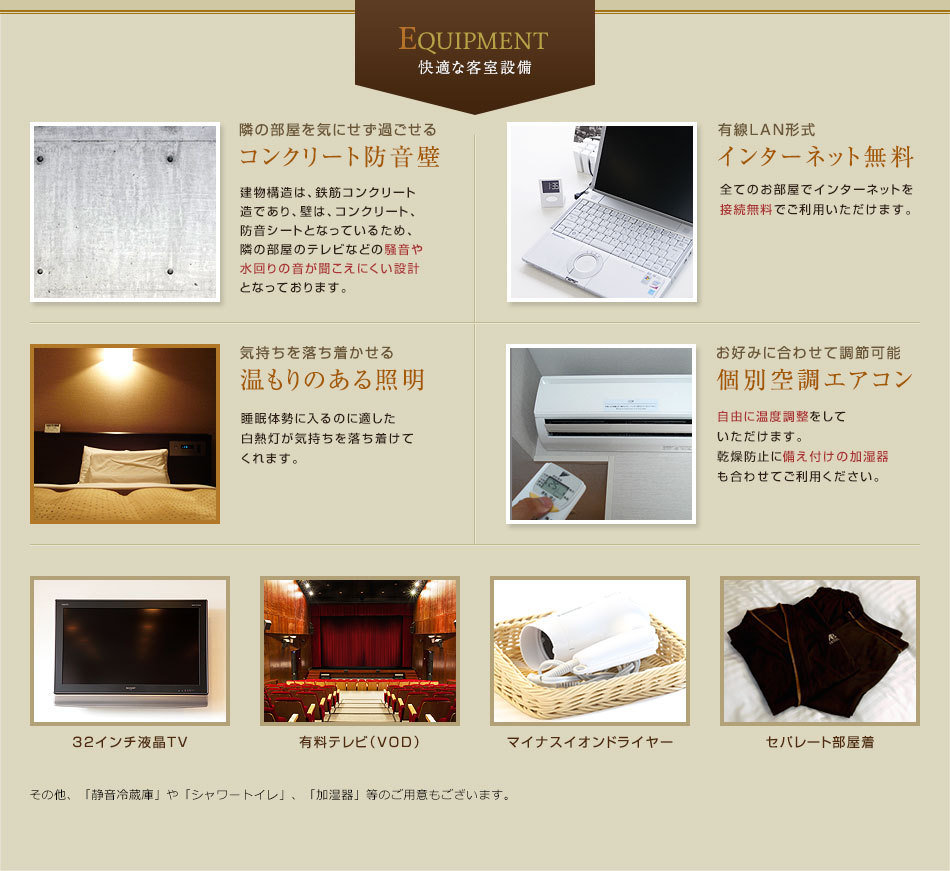 | 有料サービス | コピー、FAX、傘、ダンボール、宅配便、有料テレビ、コインランドリー、マッサージ、ソフトドリンク、アルコール、おつまみ 等 |