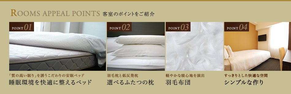 当ホテルは過ごしやすさを重視しており、心地よく眠りについていただけるようにベッドや布団、枕にこだわっております。