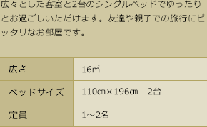 | アメニティ | フェイスタオル、バスタオル、シャンプー、トリートメント、ボディソープ、フェイス & ハンドソープ、歯みがきセット、カミソリ、くつろ着の作務衣、ヘアーブラシ、ボディスポンジ、綿棒、緑茶、スリッパ |