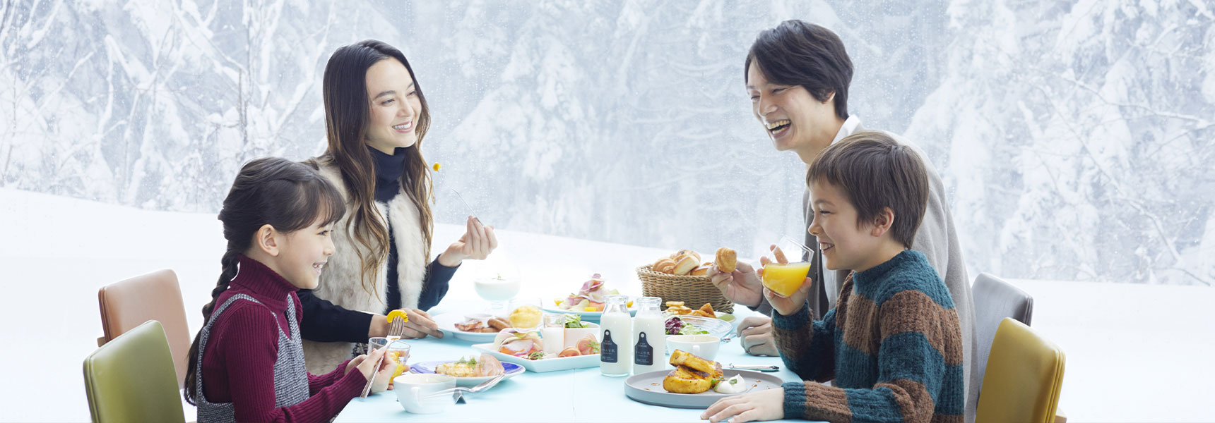 大自然の緑と、空に浮かぶ雲や舞い上がる粉雪にちなんだ白を配色した、ほっと安らげる空間。