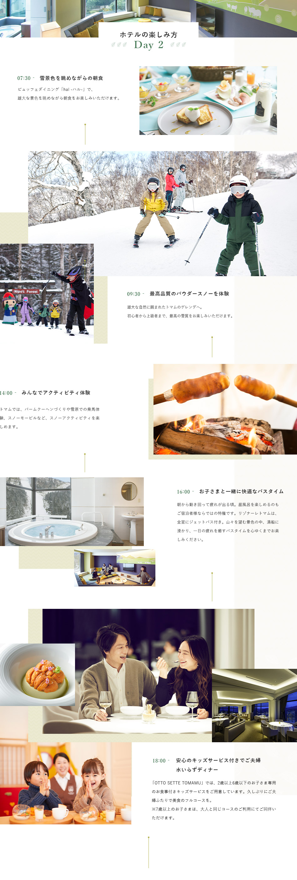 お子様預けてゆっくりされたい方向けに「GAO託児」や、食事付キッズサービスを無料利用できるメインダイニング「OTTO SETTE TOMAMU」、北海道のナチュラルワインを中心に取りそろえた「Wine House」などがご利用いただけます。