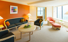 リゾナーレトマムの客室は全室100㎡以上の展望ジェットバス・サウナ付スイートルームです。お子様連れの滞在でも快適な、広々とした空間が広がっています。