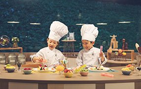 コックコートに着替えてデザートづくりに夢中になる食育体験「キッズスタジオ」をご用意しています。自ら作ったデザートを食べるときのお子様の輝くような笑顔は必見です。