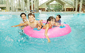 日本最大級のウェーブプールを備えた「ミナミナビーチ」なら、ガラス張りの館内は常に30度以上の常夏。季節や天候を気にせずお楽しみいただけます。遊具のレンタルもご用意しています。