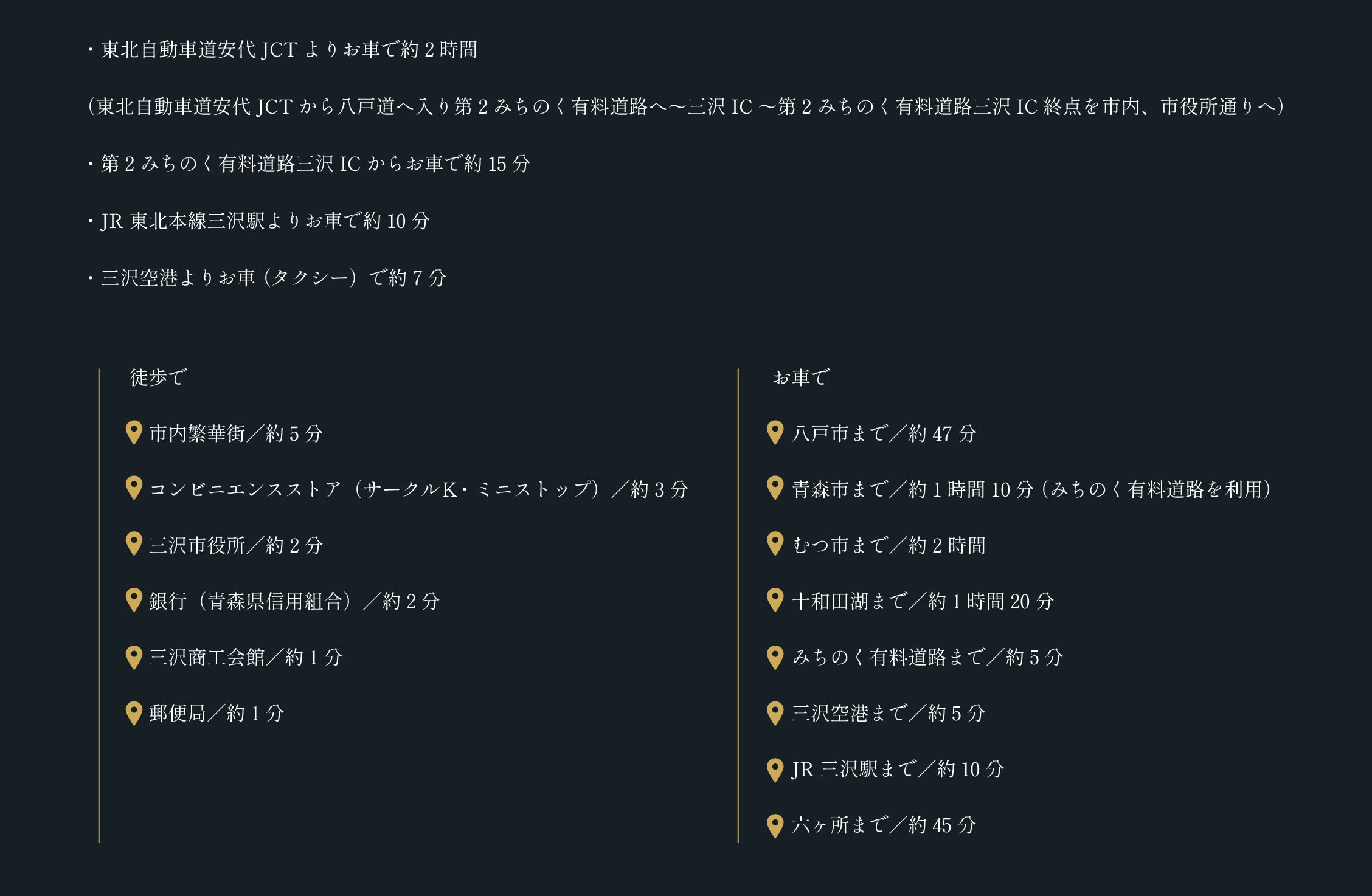 JR東北本線三沢駅よりお車にて10分/三沢空港よりお車にて7分