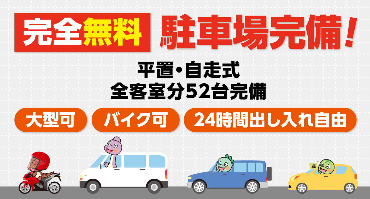 屋根付き無料駐車場を50台完備。高さ制限有り、ハイルーフ可、大型可、バイク可。予約不要でご利用OK。