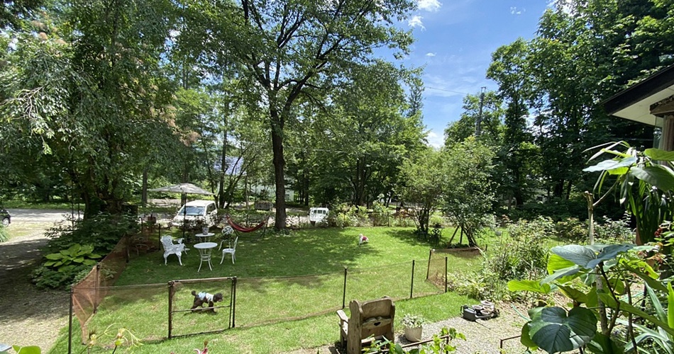 200 平米の天然芝のドッグランとそれを囲むフラワーガーデンで、時間を忘れごゆっくりお過ごしくださいませ。