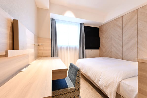 140cm幅のダブルベッドを設置したダブルルーム。2名まで(添い寝除く)ご利用可能です。