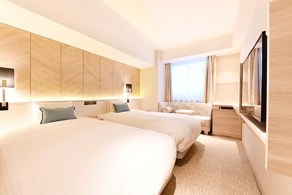 120cm幅のセミダブルベッド2台設置のツインルーム。2名まで(添い寝除く)ご利用可能です。