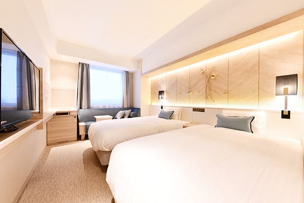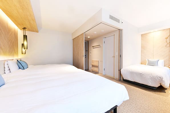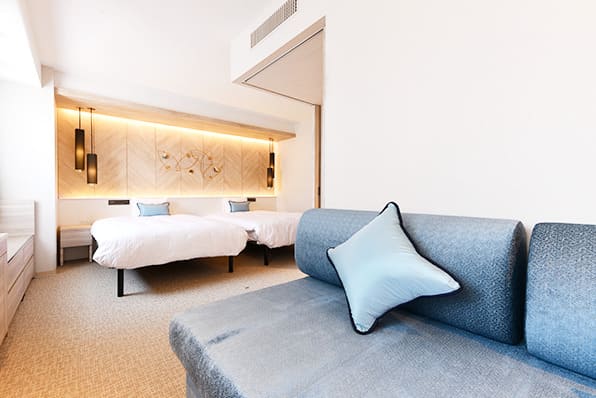 120cm幅のセミダブルベッド2台設置し、ゆったりとしたツインルーム。2名まで(添い寝除く)ご利用可能です。