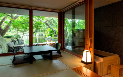 静寂な日本庭園を散策したり、貸し切り温泉風呂を満喫したら、季節の料理に舌鼓。