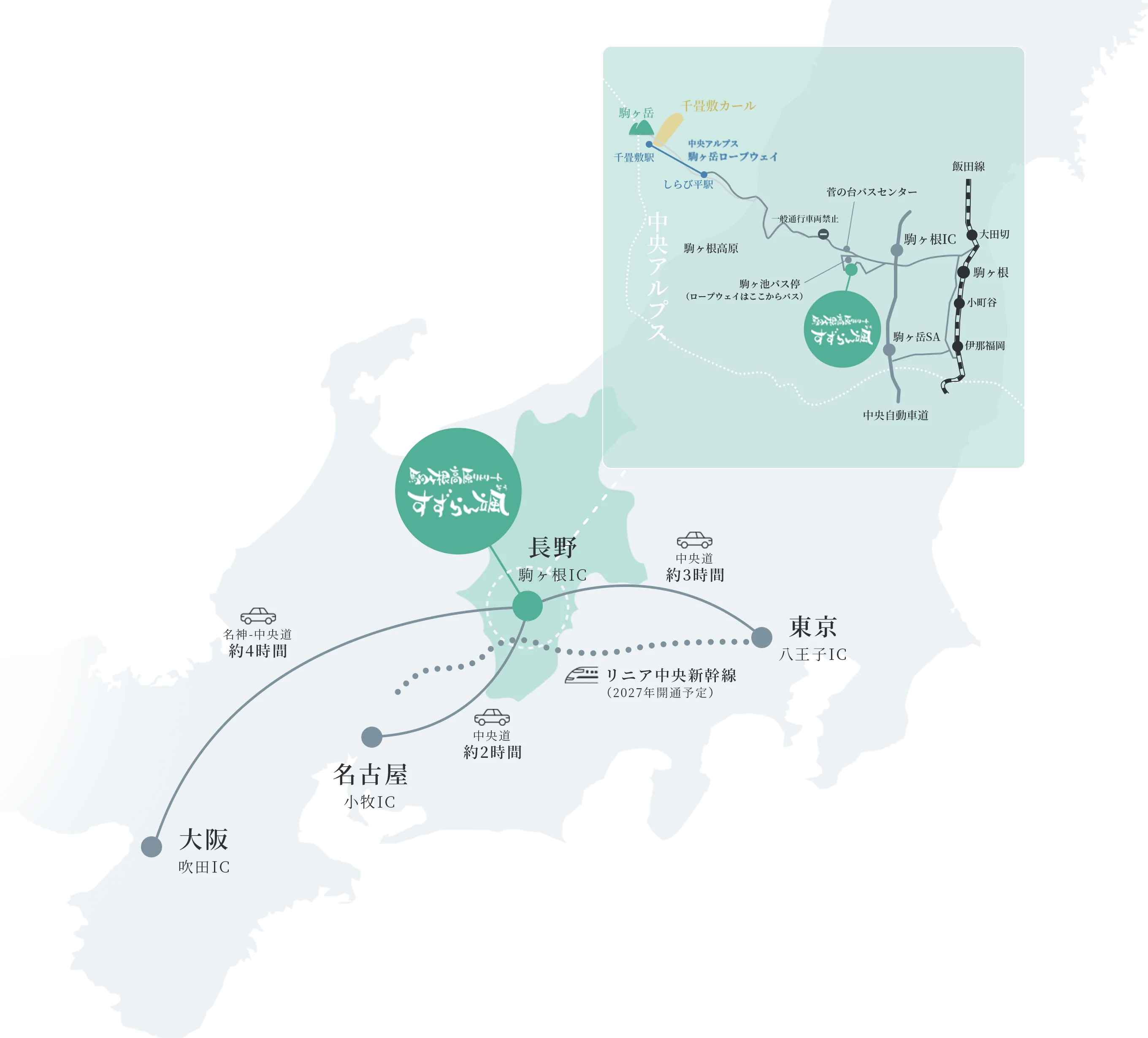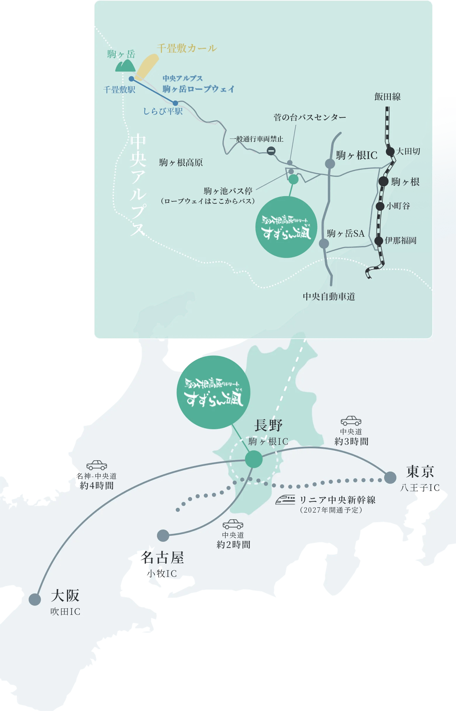 電車:JR飯田線「駒ケ根駅」から車で約15分/車:中央自動車道「駒ケ根IC」から約5分