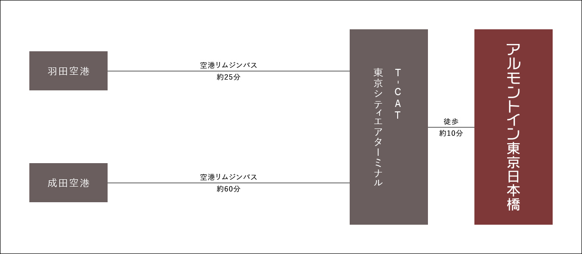 空港リムジンバスでT-CAT 東京シティエアーターミナルまで約60分→徒歩約10分