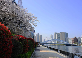 隅田川両岸に沿って整備された親水テラスで、散歩やジョギングのコースとして人気です。また、各所には手入れされた花壇などもあり四季折々の表情が楽しめます。さらに随時開かれる各種イベントにも注目です。