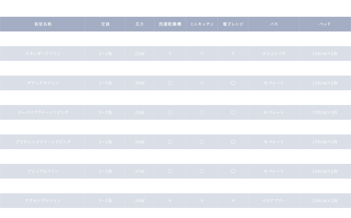 無料Wi-Fi / 個別空調エアコン / バストイレ / スマート液晶テレビ / 冷蔵庫 / ドライヤー / 電気ケトル / アラーム時計 / 金庫