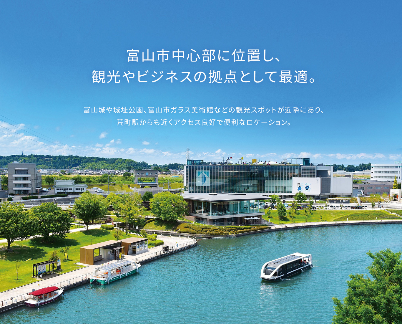 JR富山駅より徒歩約15分、富山市内路面電車で約8分(荒町駅下車徒歩1分)、車で約5分。富山インターより車約13分