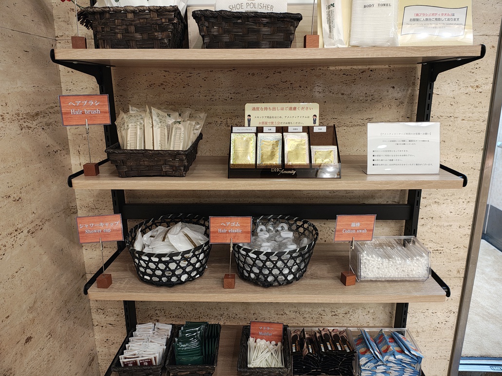 | 当ホテルではSDGsの省資源化の取り組みの一環として、ご必要なアメニティをセルフサービスでお持ちいただく形となっております |