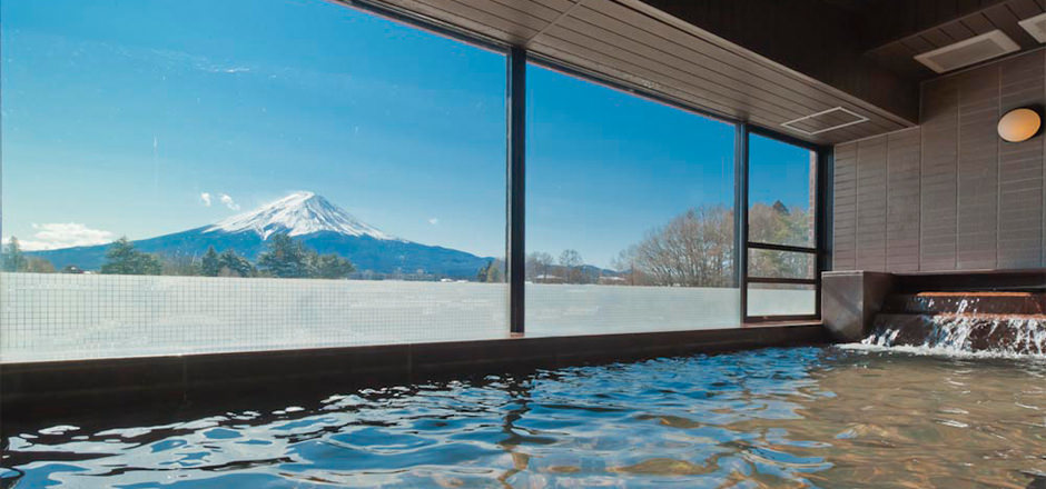 雄大な富士山と相対峙し、悠然と湯に温もる展望大浴場。