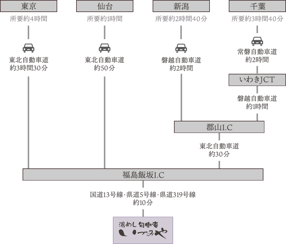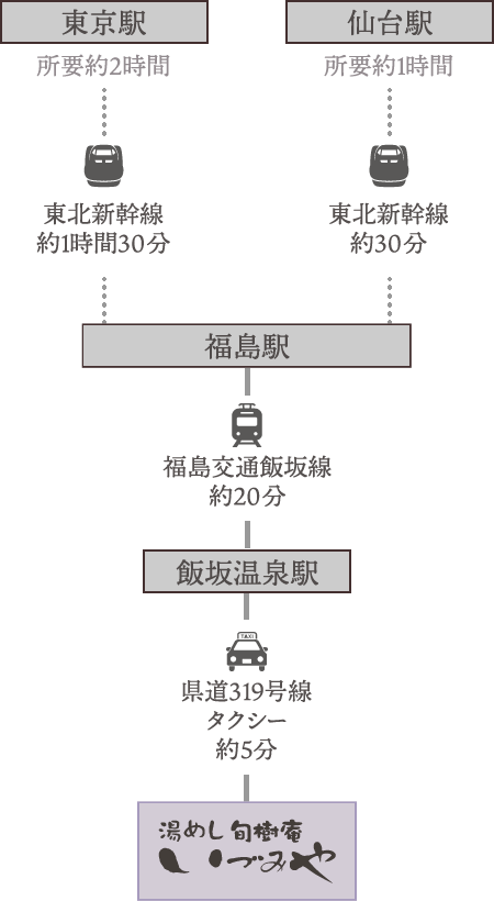 東京から、電車で2時間、仙台から電車で1時間。福島駅からお車で約30分です。無料駐車場もございますので是非ご利用ください。