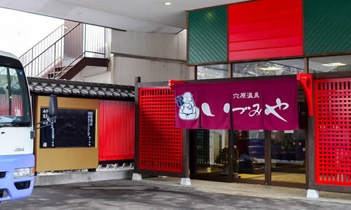 15名様以上の団体様のみマイクロバスでの送迎を致します。(※バスの空きがない場合は有料手配のご相談となります。)ご利用のお客様の目印となるように、バス側面にマグネット式のステッカーを貼り付け致しました。駅前にて当館の送迎バスをお探し頂く際の目印としてご利用下さい。