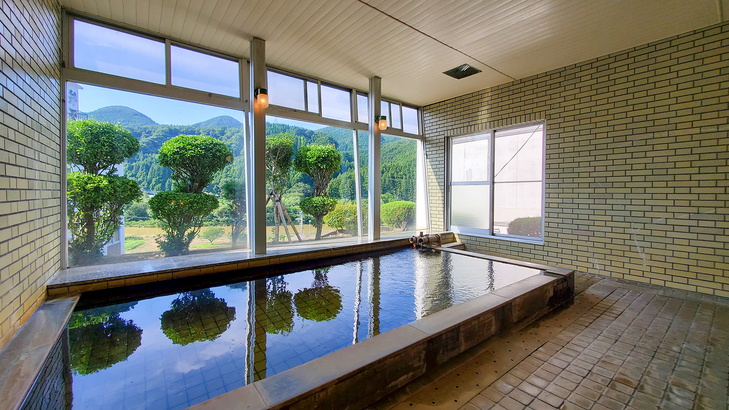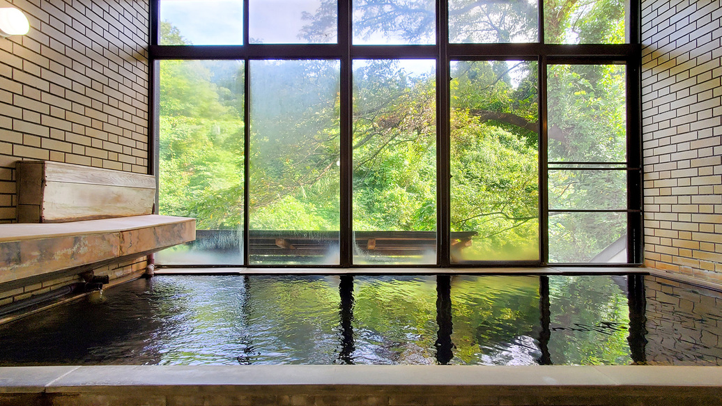 【展望温泉】男性用大浴場 温泉につかり窓に目をやると「眼下に荒雄川、見上げれば三条山」という山間の温泉地らしい風景を体感できる男性大浴場。