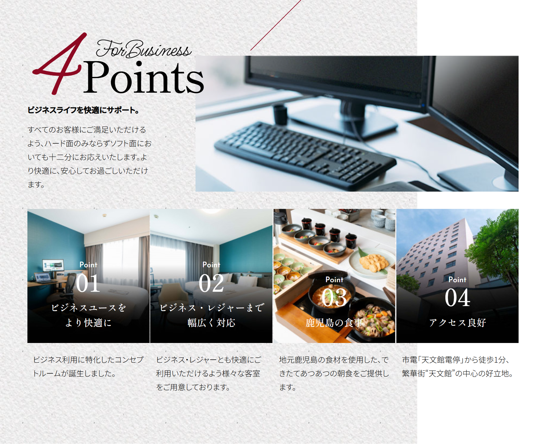 空港リムジンバス【天文館】下車徒歩3分。路面電車【天文館通】下車徒歩1分。