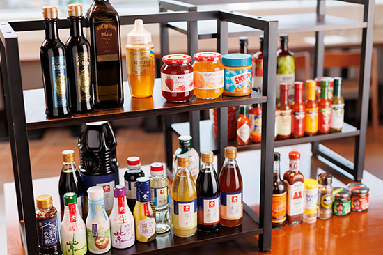 朝食バイキングに世界の調味料をご用意しました。普段使うことの少ない調味料をガレットやサラダに併せて自分好みの味を再発見。