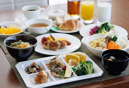 両国ならではの「朝ちゃんこ鍋」、「焼き魚」、「スクランブルエッグ」など、約30種類の和洋食をブッフェ形式でお楽しみいただけます。