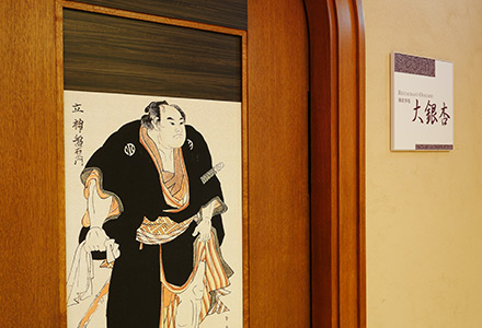 入口や店内各所に力士の浮世絵デザインを配し、国技館がある両国の地ならではの下町情緒あふれる御食事処で、和洋バイキングをご用意しております。