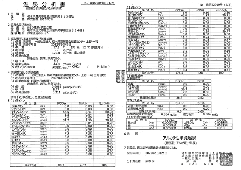 | 備品 | ドライヤー、石鹸(固形)、ボディーソープ、シャンプー、リンス、ハミガキセット、くし、あさやオリジナル化粧品(温泉化粧水、乳液、ヘアトニック等) |